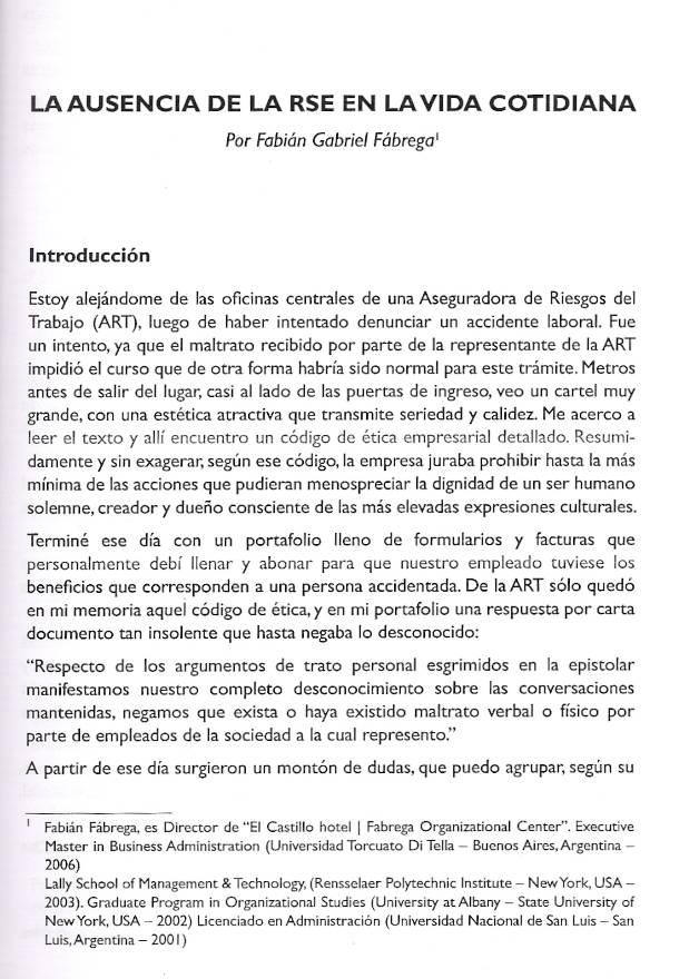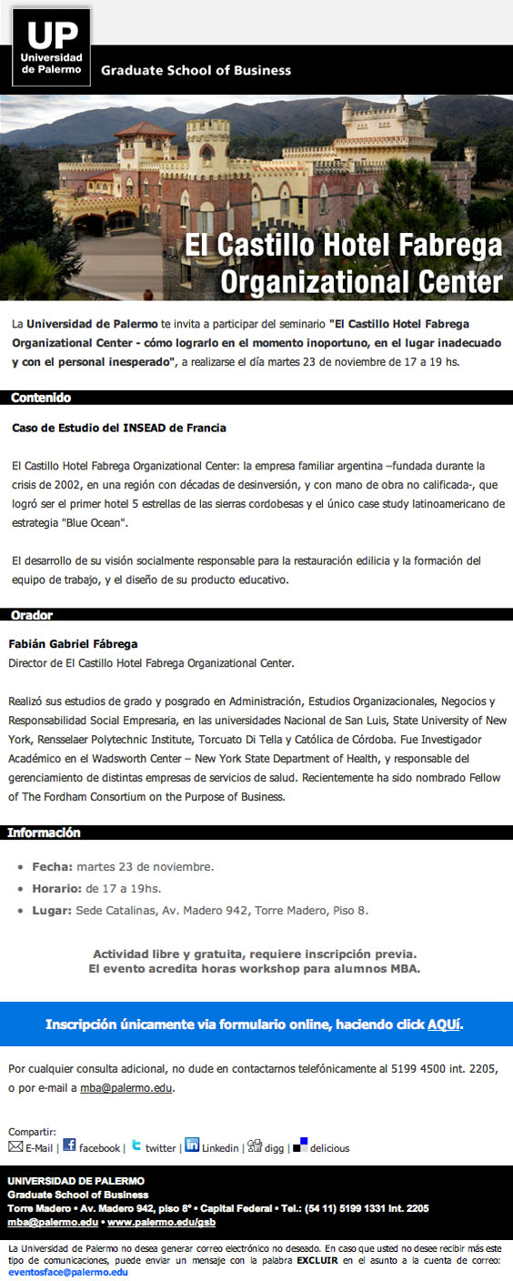 El 23 de noviembre de 2010, en la Graduate School of Business de la Universidad de Palermo, se realizó el seminario «El Castillo Hotel Fabrega Organizational Center – cómo lograrlo en el momento inoportuno, en el lugar inadecuado y con el personal inesperado».